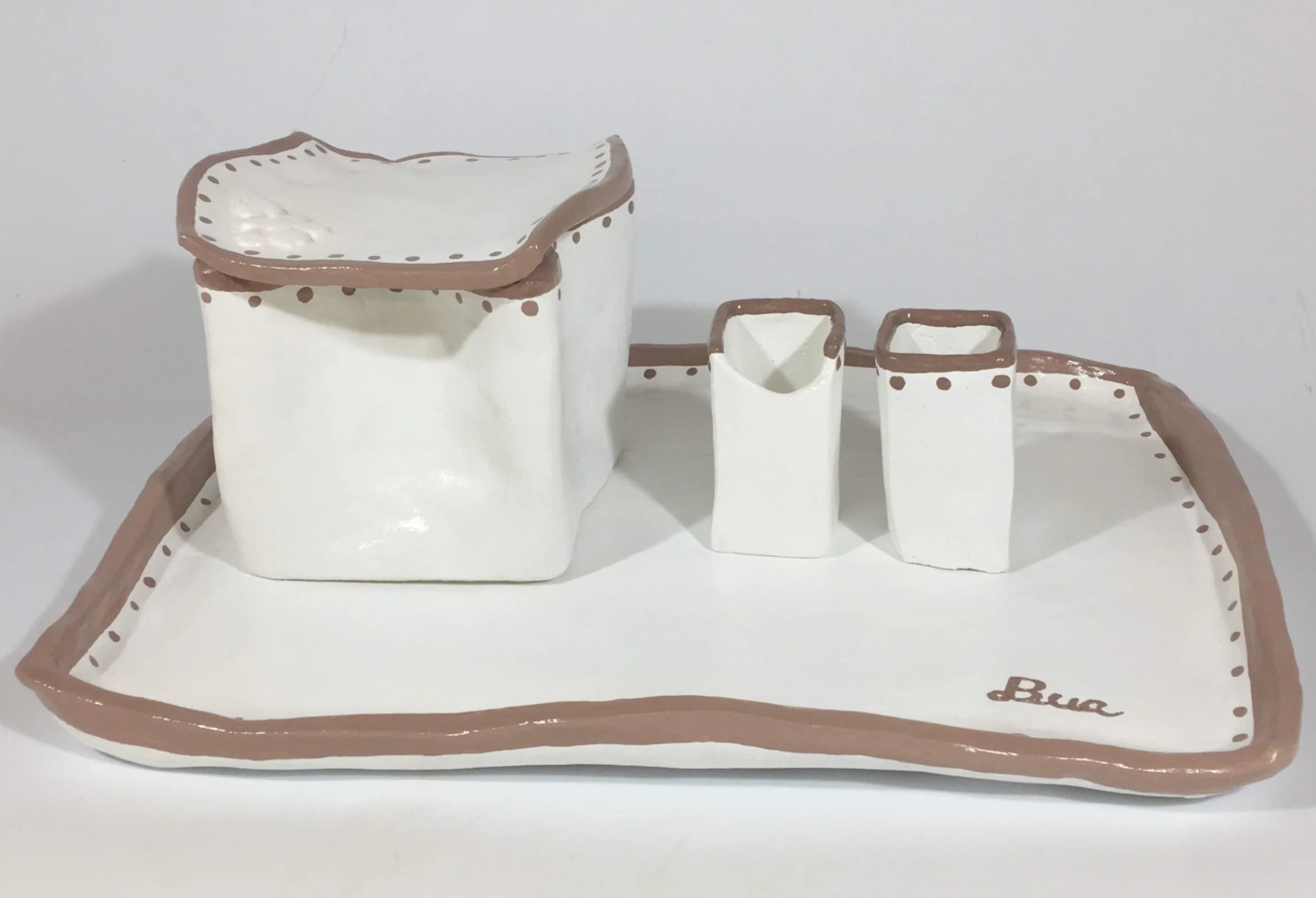 Handmade pottery thoughtfully inspired by traditional Japanese culture and aesthetics. The design is unique and one-of-a-kind, featuring a teapot and matching teacups. During the making, one cup was accidentally broken; I chose to keep it, as its repaired imperfection gives the set a distinctive character, suggesting that accidents can yield beauty and offer meaningful lessons.